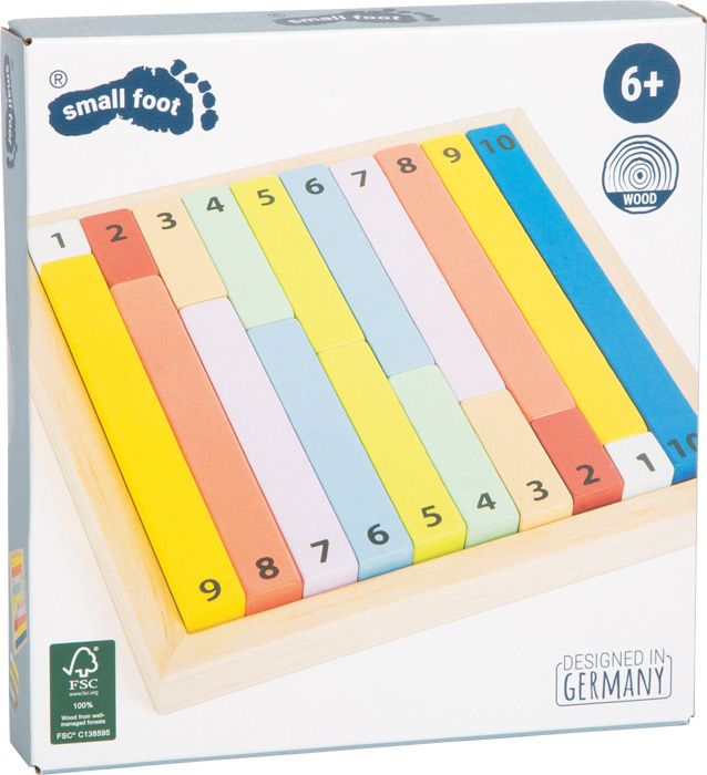 Wymiary podstawy: 17,5 x 17,5cmWymiary klocków: od 1,5 x 1,5cm do 1,5 x 15cm Materiał: lakierowane drewno Wiek : 4+ Referencja: 111167 Deklaracja zgodności CE
