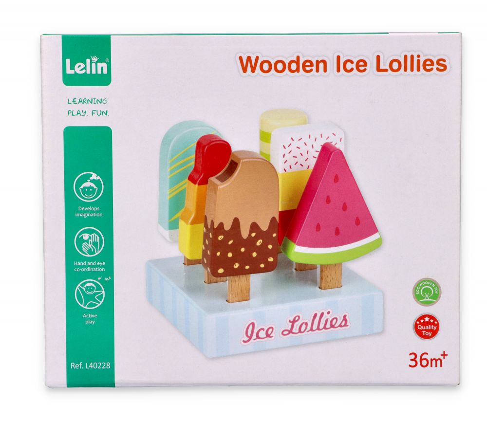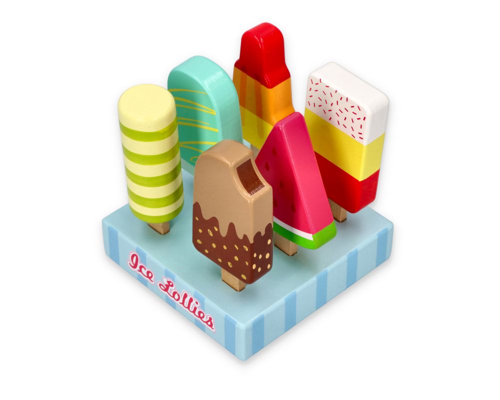 W zestawie znajdzieje elegancką podstawkę pod lody oraz 6 lodów na patyku. Każdy z lodów jest inny. I tak np. mamy loda arbuzowego w kształcie trójkącika, możemy też znaleźć loda twister z zakręconą polewą oraz owalnym, podłużnym kształem a także klasyczny lód w polewie czekoladowej z nadgryzioną końcówką.