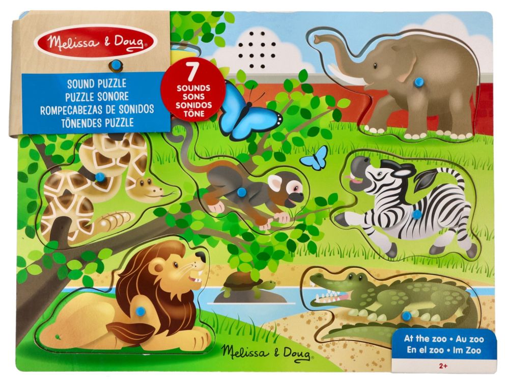 Układanka wykonana jest z naturalnego drewna, złożona z podstawy i 7 zwierzątek z Zoo. Znajdziecie tu: krokodyla, lwa, węża, małpkę, słonia, zebrę oraz papugę. Pod każdym kształtem znajduje się dokładnie taki sam obrazek jak na puzelku.