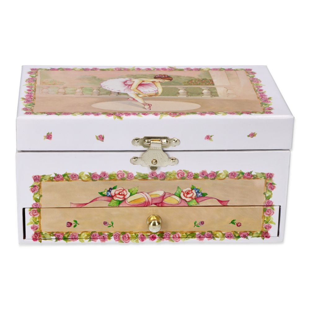 Na dole pudełeczka przydatna i praktyczna szufladka na drobiazgi. Na wieczku od środka zamontowane jest lusterko. Mechanizm pozytywki jest nakręcany na kluczyk z tyłu, więc nie wymaga baterii.