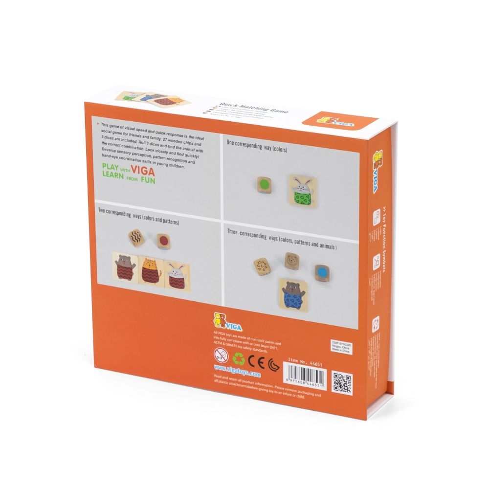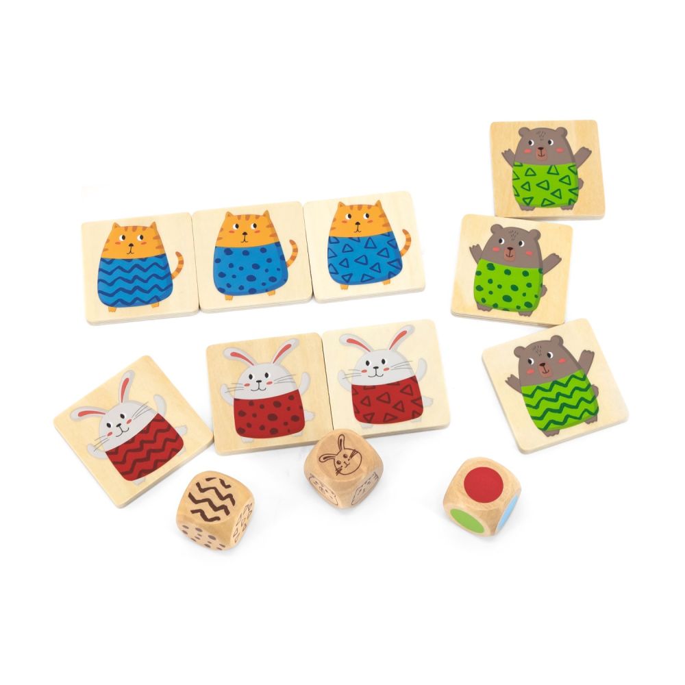 - Wariant 3 (trudny) – rzucaj wszystkimi kostkami a następnie zlokalizuj i dobierz jedyny pasujący element układanki np. niebieski kotek w paski, zielony królik w kropki lub czerwony niedźwiedź w trójkąty. W tym wariancie losując rzut macie tylko 1 możliwy element do podniesienia.