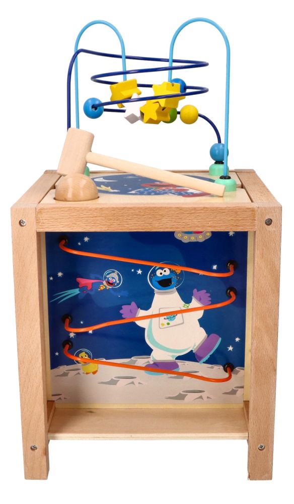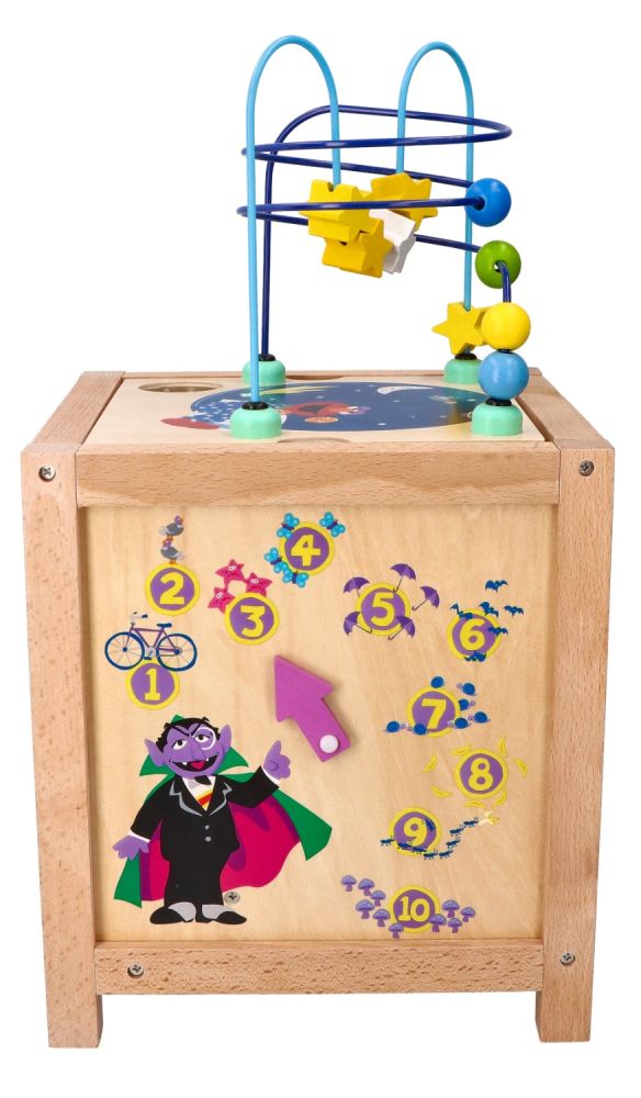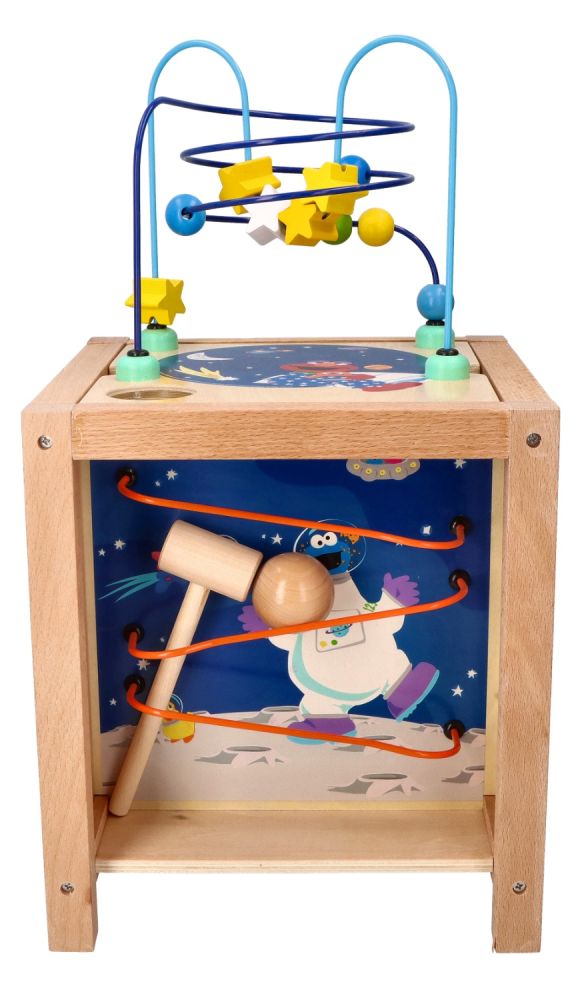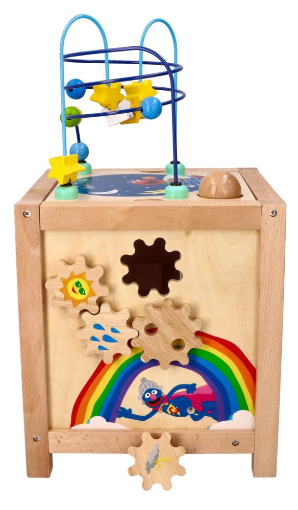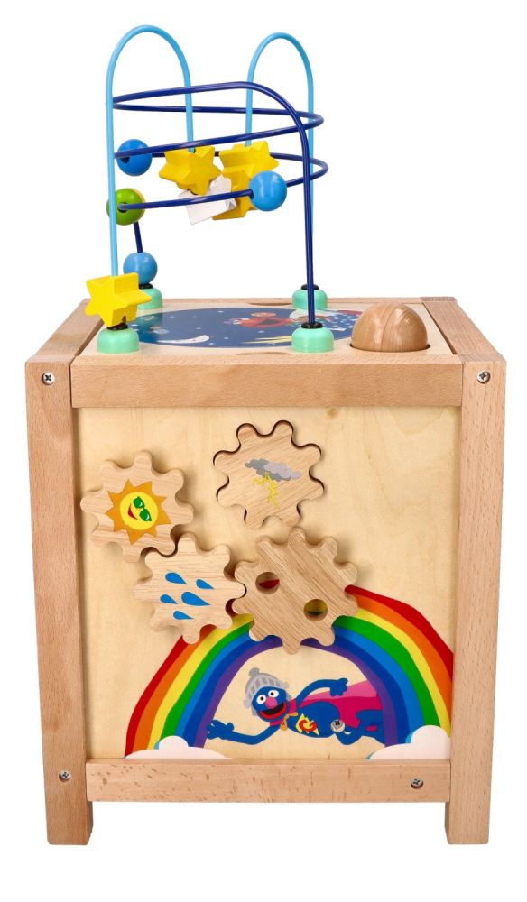- Ostatnia ze ścianek, umieszczona na górze kostki to klasyczna pętla motoryczna składająca się z 2 pręcików. Jeden z pręcików wygięty w kształt paraboli, drugi na kształt spiralki. Na pręcikach znajdują się kolorowe, drewniane koraliki w kształcie kuleczki oraz gwiazdki.