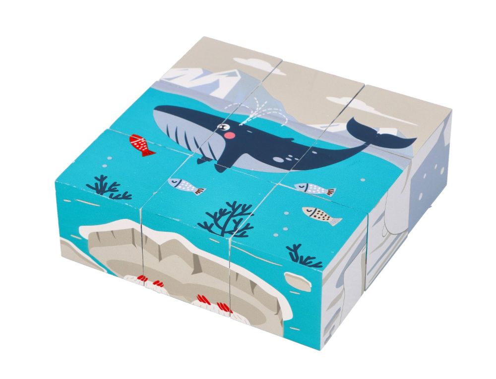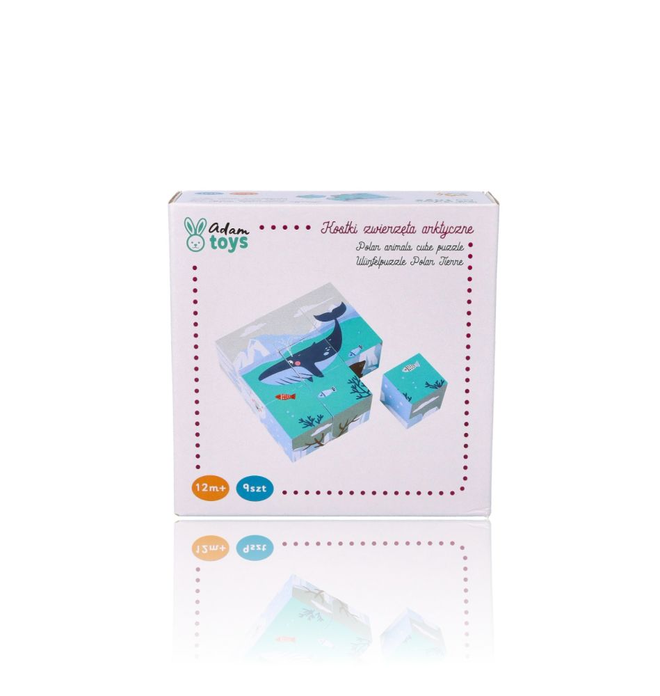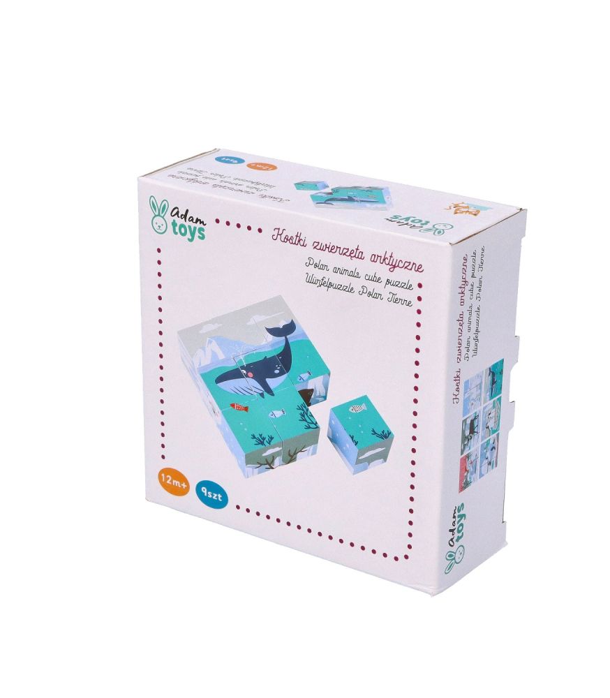 Układanka składa się z 9 sześciennych klocków dzięki czemu możecie ułożyć 6 obrazków ukazujących zwierzęta Arktyki w ich naturalnym środowisku: