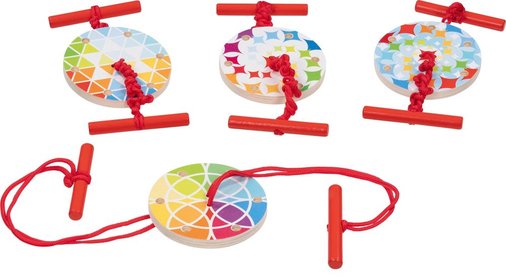 Kolorowy dysk znajduje się na podwójnym sznureczku, który posiada drewniane uchwyty na jego końcach. Cała magia produktu tkwi w szczególe, przez środek dysku są poprowadzone 2 sznurki, które po kilkukrotnym skręceniu a następnie rozciągnięciu rozpoczną wirowanie dysku.