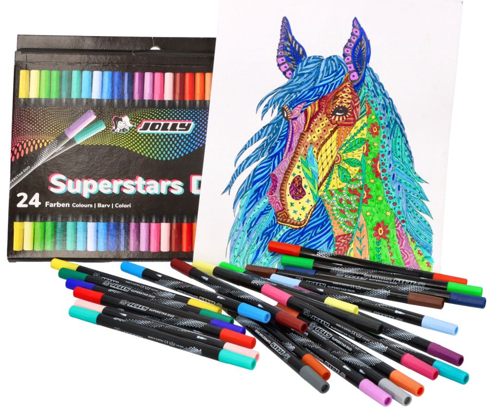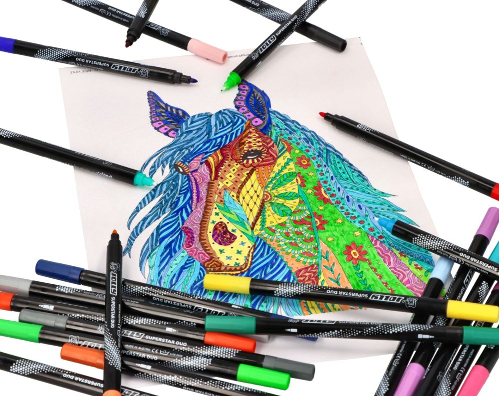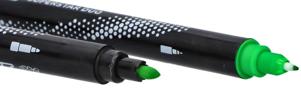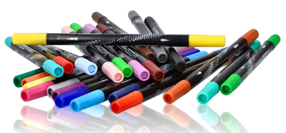 Każdy mazak jest dwustronny co daje jeden kolor, ale z cieńszą lub grubszą końcówką w zależności od rodzaju wykończenia jaki chcemy osiągnąć. Do bardziej precyzyjnych sprawdzi się cienka końcówka, do zakreśleń lub pokolorowania większej części sprawdzi się grubsza.