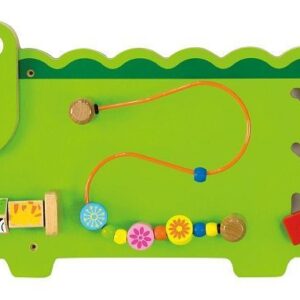• Pierwszy : Jako jedyny z paneli jest w kolorze pomarańczowym i posiada żółte czółka. Oprócz walorów estetycznych na panelu znajdziemy pętle motoryczną, na której z kolei znajduje się 8 korali o różnych kształtach i kolorach. Nad pętlą znajduje się czerwony nosek, i para oczu zamontowana na metalowym pręciku.