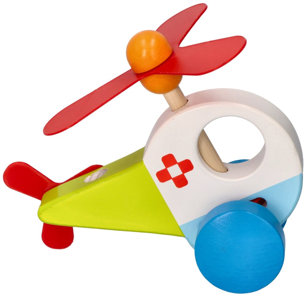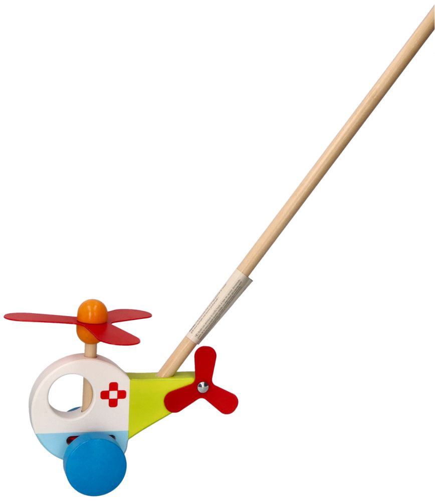 Drewniany helikopter z obracającym się śmigłem będzie idealnym narzędziem zachęcającym maluchy do chodzenia. Dzięki dołączonemu w zestawie drewnianemu patykowi maluch będzie mógł go pchać w pozycji stojącej.
