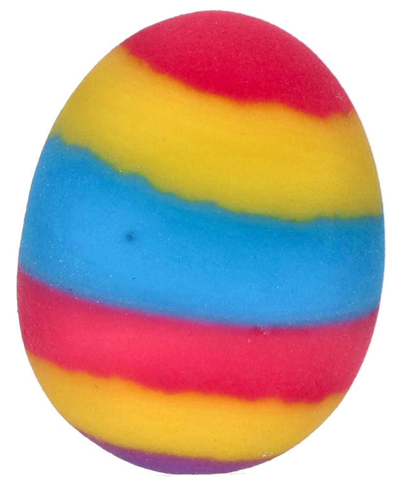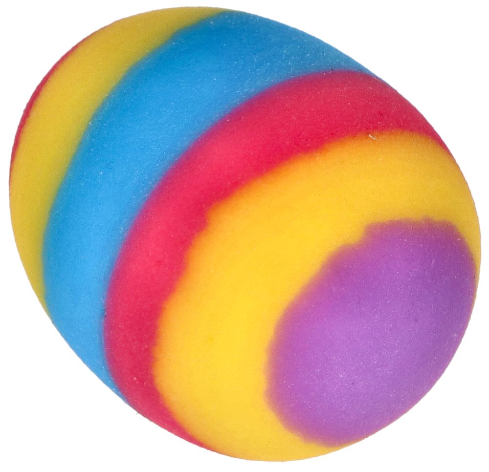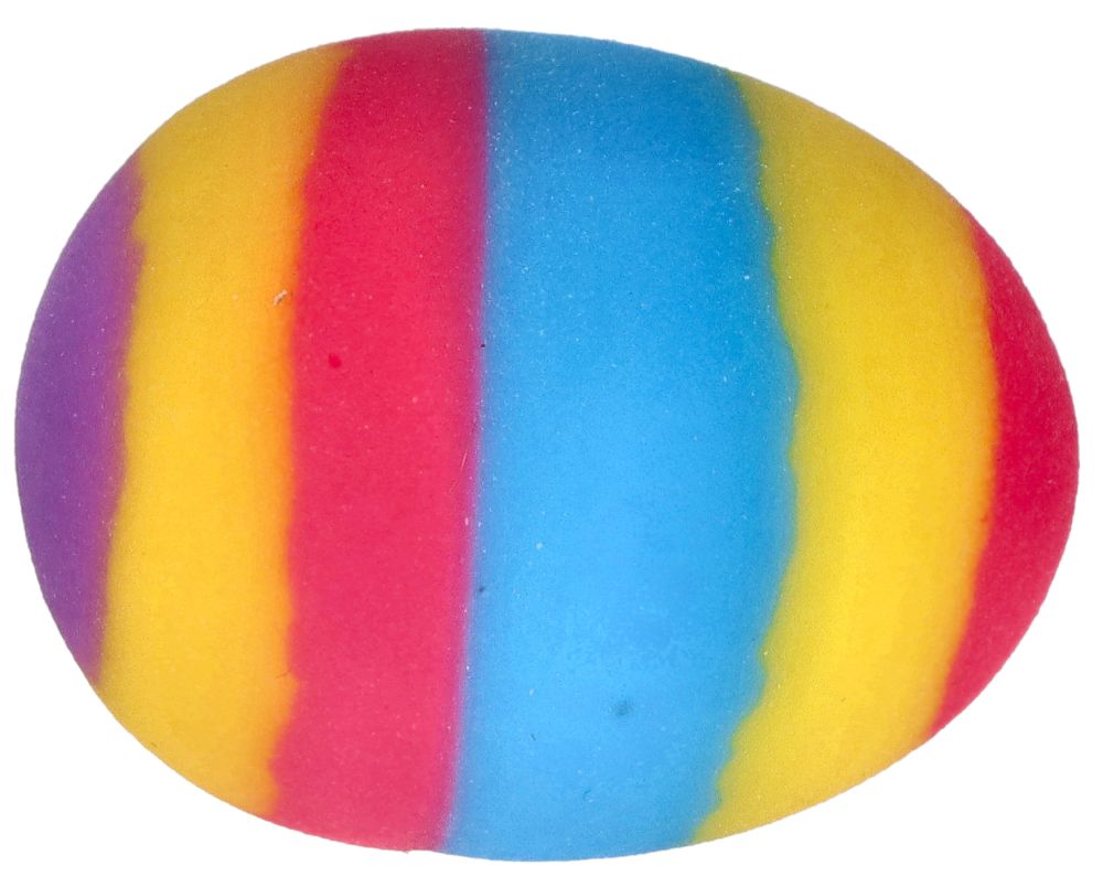 Gumowa piłeczka odbija się od twardych powierzchni. Piłeczka ma kształt jajka, ale jest w żywej kolorystyce.