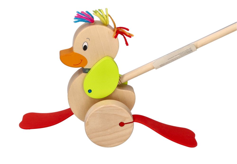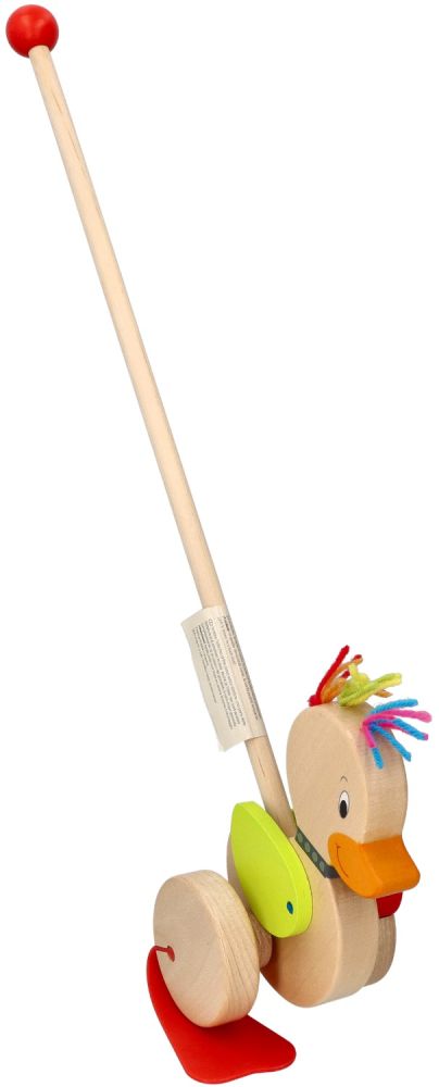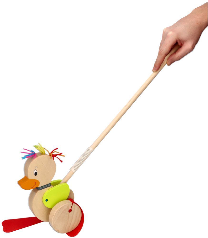Kaczka z kolorowymi włoskami na głowie to ciekawa zabawka pomagająca w nauce chodzenia. Dzięki dołączonemu w zestawie drewnianemu patykowi maluch chętnie będzie się poruszał. Kaczka w większości w kolorze naturalnego drewna, posiada długie czerwone płetwy wykonane z gumy oraz zielone skrzydła.