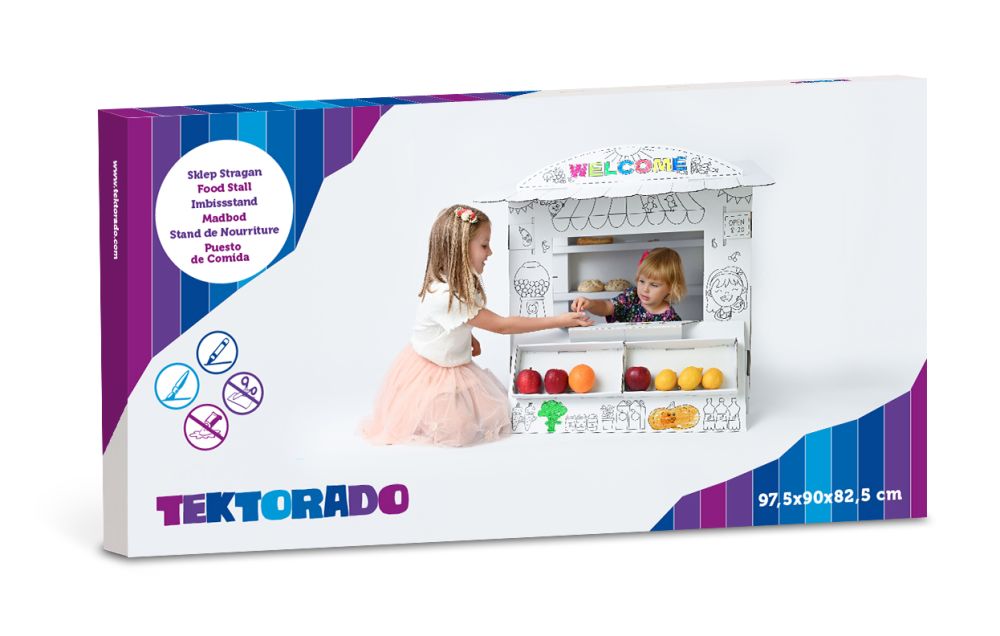 Stragan polskiej firmy Tektorado to pomysł na świetną zabawę zarówno w domu, jak i w ogrodzie. Wytrzymała tektura świetnie się sprawdzi, spełniając oczekiwania nie tylko najmłodszych dzieci. Zabawka została wykonana z 5-warstwowej, białej tektury falistej. Zabawa polega na złożeniu Waszego własnego, tekturowego straganu oraz na jego pomalowaniu. Możecie do tego celu użyć farb, kredek lub mazaków – polecamy produkty marki Jolly z naszej oferty.