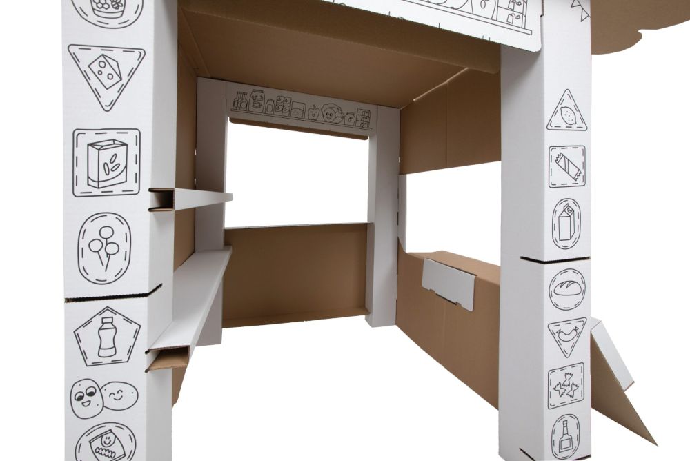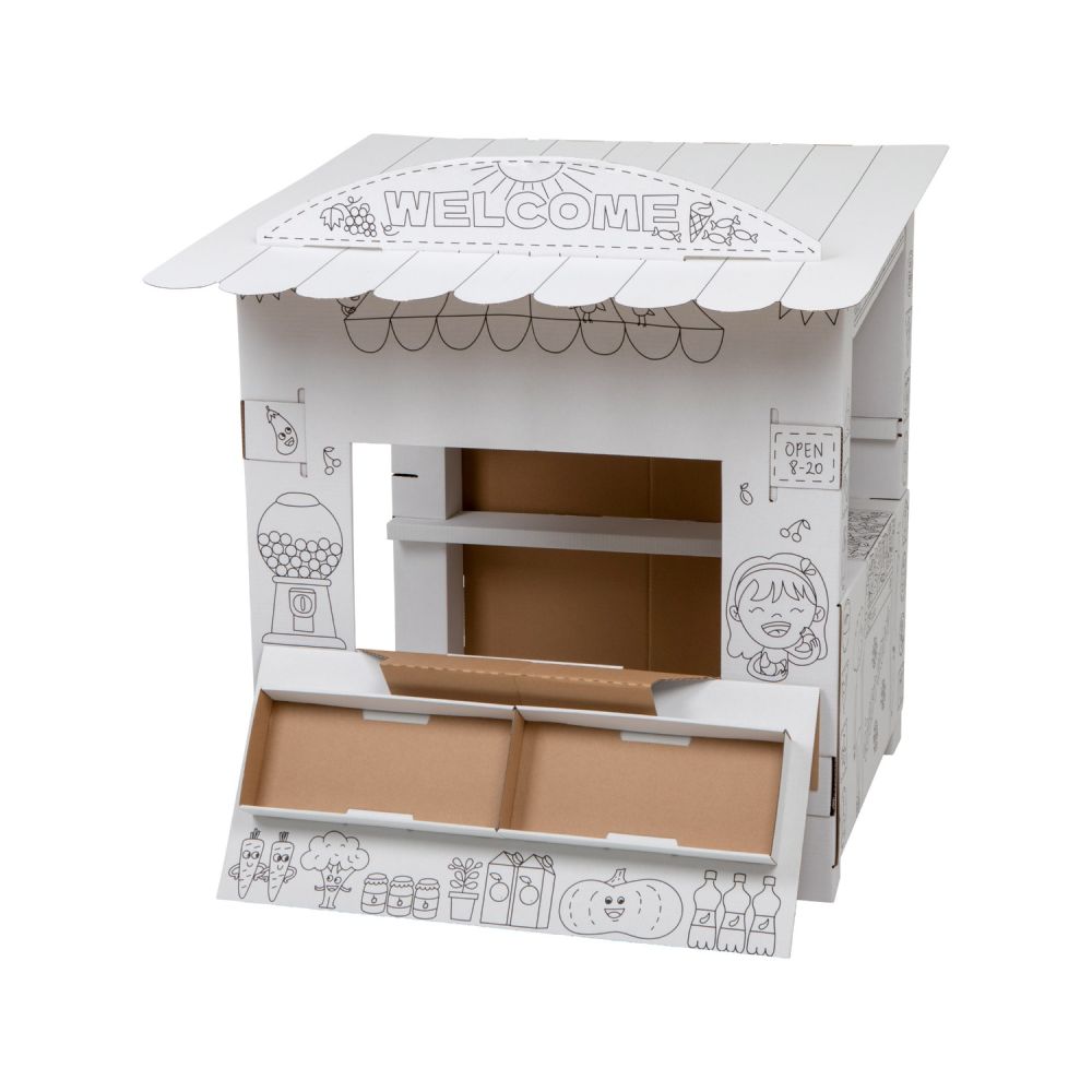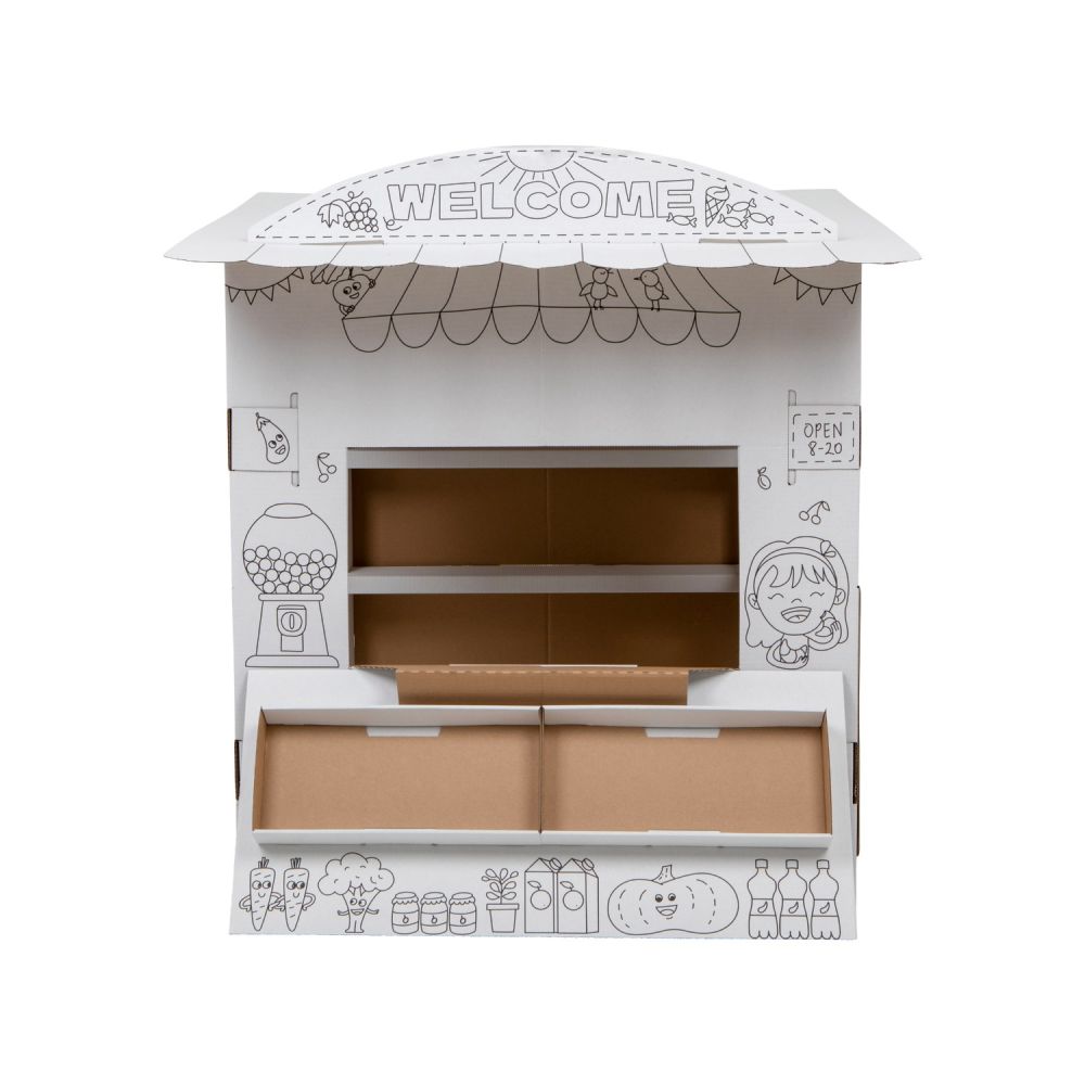 Zawartość: tekturowy stragan do złożenia i kolorowania/malowania (nie zawiera kredek ani farbek).Wymiar produktu po złożeniu: 97 x 90 x 82,5 cm