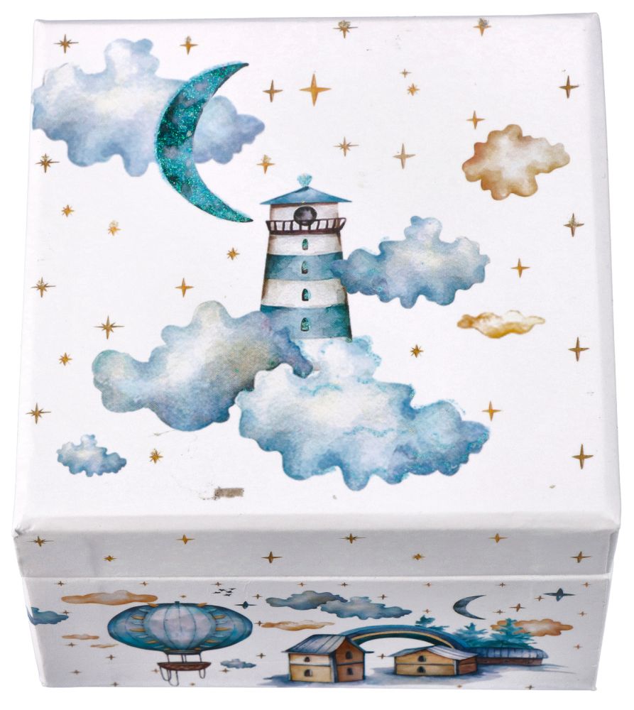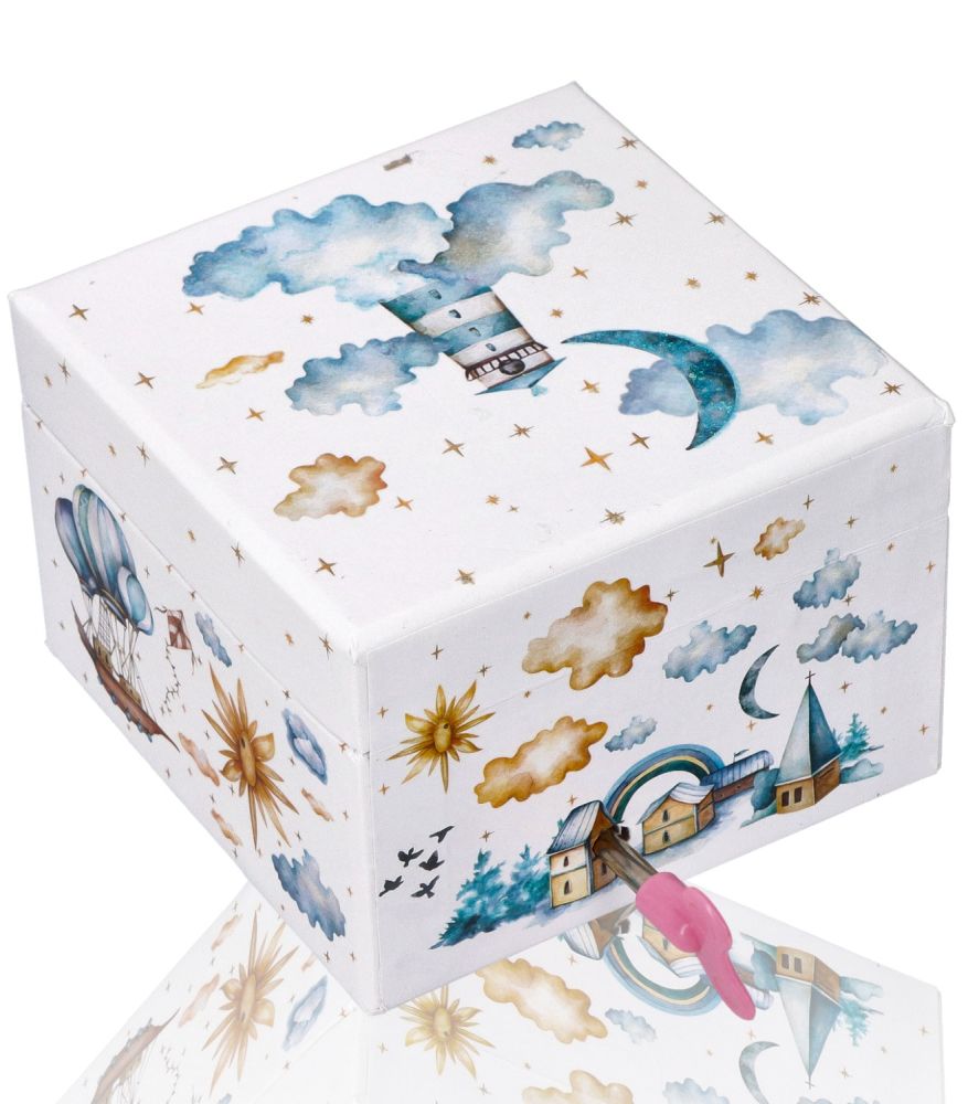 Pozytywka z motywu krainy snów – na jej bokach znajdziecie chmurki, księżyc oraz latarnię morską. Dodatek stanowi niewielka wioska oraz statek powietrzny balon, w tle widoczne mieniące się gwiazdki. Księżyc zdobione mieniącym się zielono-niebieskim brokatem, sprawia że pozytywka ma delikatny lecz niezbyt przesadny błysk. Główną role odgrywa prześliczna, mieniąca się we wszystkich kolorach tęczy baletnica.