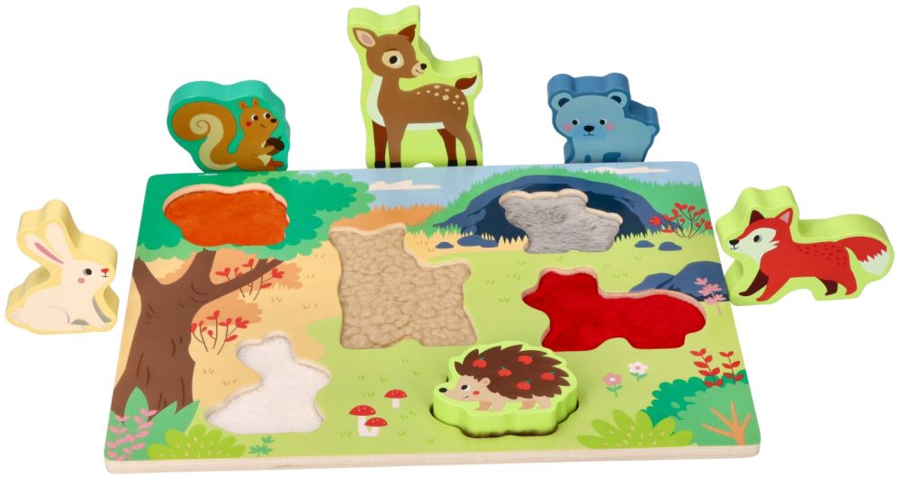 Przedstawiamy wesołą wielofunkcyjną układankę Zwierzęta Lasu. Zabawka zawiera 6 zwierzątek, które dziecko dopasowuje do kształtu na układance. Znajdziecie tu zająca, jeżyka, liska, wiewiórkę, misia oraz sarenkę. Dodatkowo pod każdym puzzlem odkryje materiał o różnych strukturach.